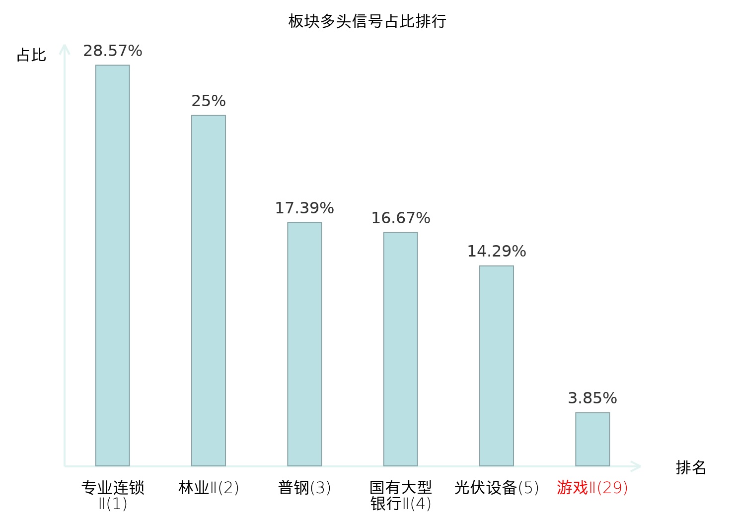 全市场所有行业板块中主力多头信号占比排名中,专业连锁Ⅱ板块位居第一。专业连锁Ⅱ板块名次提升最快,较昨日上升122位。