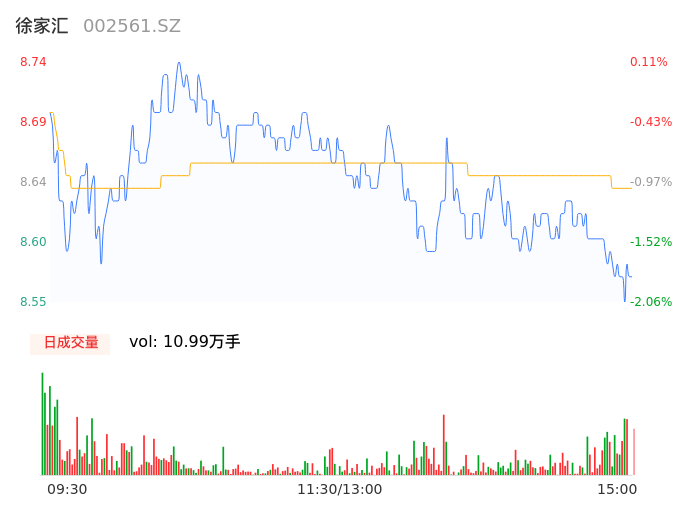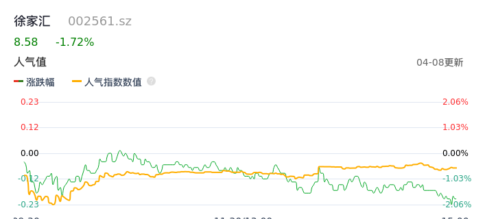 04月08日,徐家汇收报8.58,股价涨幅-1.72%,成交金额9493.06万元,换手率2.65%。