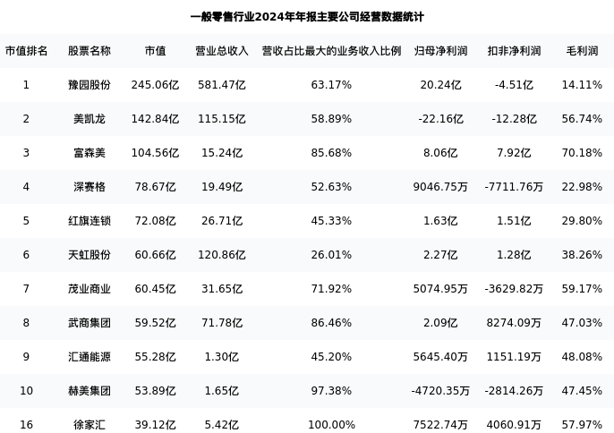 徐家汇最新报告期数据为年报,下表汇总了一般零售行业内市值靠前的公司年报主要经营数据