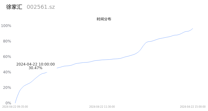 首先我们来看当日成交的时间分布。将今日交易时间按照5分钟的时间间隔进行切片,并绘制分布直方图进行观察。可以发现,10点之前的成交量占全天成交量的30.47%,这说明,该股票活跃时段换手火爆,资金热情高涨。