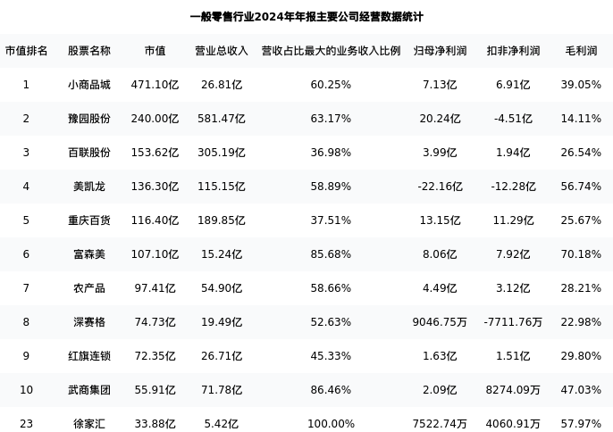 徐家汇最新报告期数据为年报,下表汇总了一般零售行业内市值靠前的公司年报主要经营数据