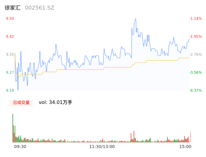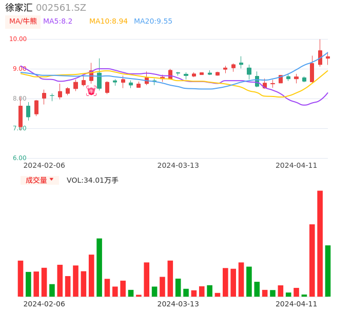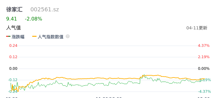 04月11日,徐家汇收报9.41,股价涨幅-2.08%,成交金额3.17亿元,换手率8.21%。