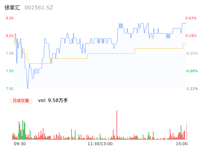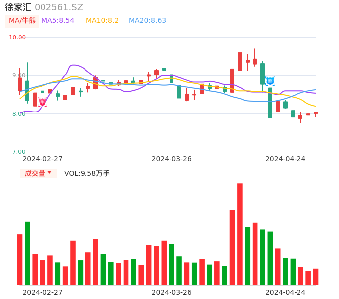 04月24日,徐家汇收报8.05,股价涨幅0.63%,成交金额7658.59万元,换手率2.31%。