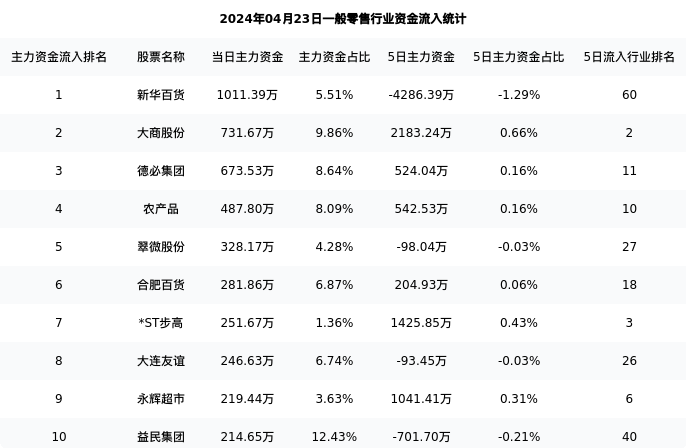 从主力资金流向来看,一般零售行业今日主力资金流入7.87亿元,在所有申万二级行业中排名:93/131。