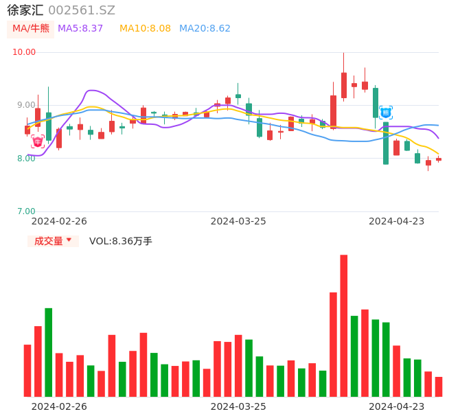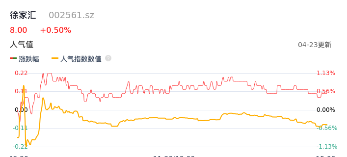 04月23日,徐家汇收报8.00,股价涨幅0.50%,成交金额6695.22万元,换手率2.02%。