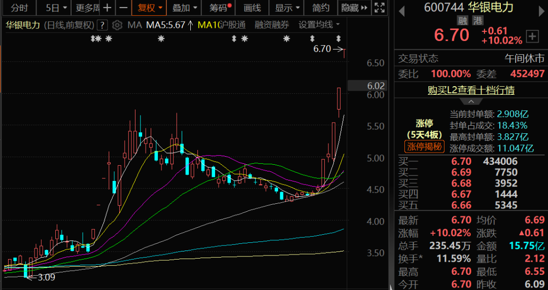 华银电力受业绩预增利好刺激,股价应声涨停,今日再度以涨停开盘,近5个交易日4度封板,股价创近4年新高,今年以来累计大涨逾115%。