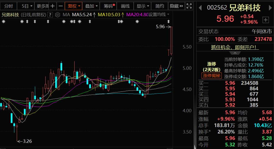 兄弟科技亦预计,2025年1月—6月实现净利润为6000万元—7500万元,同比增长325%—431.25%。兄弟科技在上周五涨停后,今日再度快速涨停,创近3年来新高。