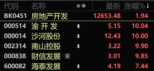 房地产股早间全线走强,板块指数放量上扬,一度涨逾2%,创2个多月来新高。财信发展、沙河股份、南山控股等盘中均直线拉涨停。