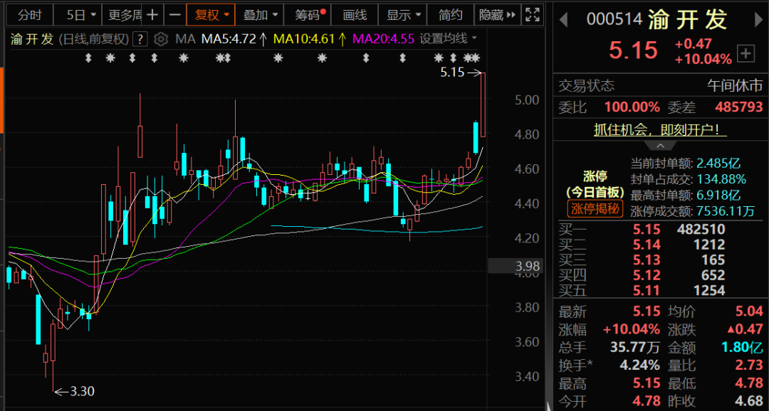 渝开发在上周末公告,预计2025年上半年实现净利润为1.75亿元—2.25亿元,同比增长632%—784%。渝开发早间开盘后仅约4分钟就直线拉涨停,创年内新高。