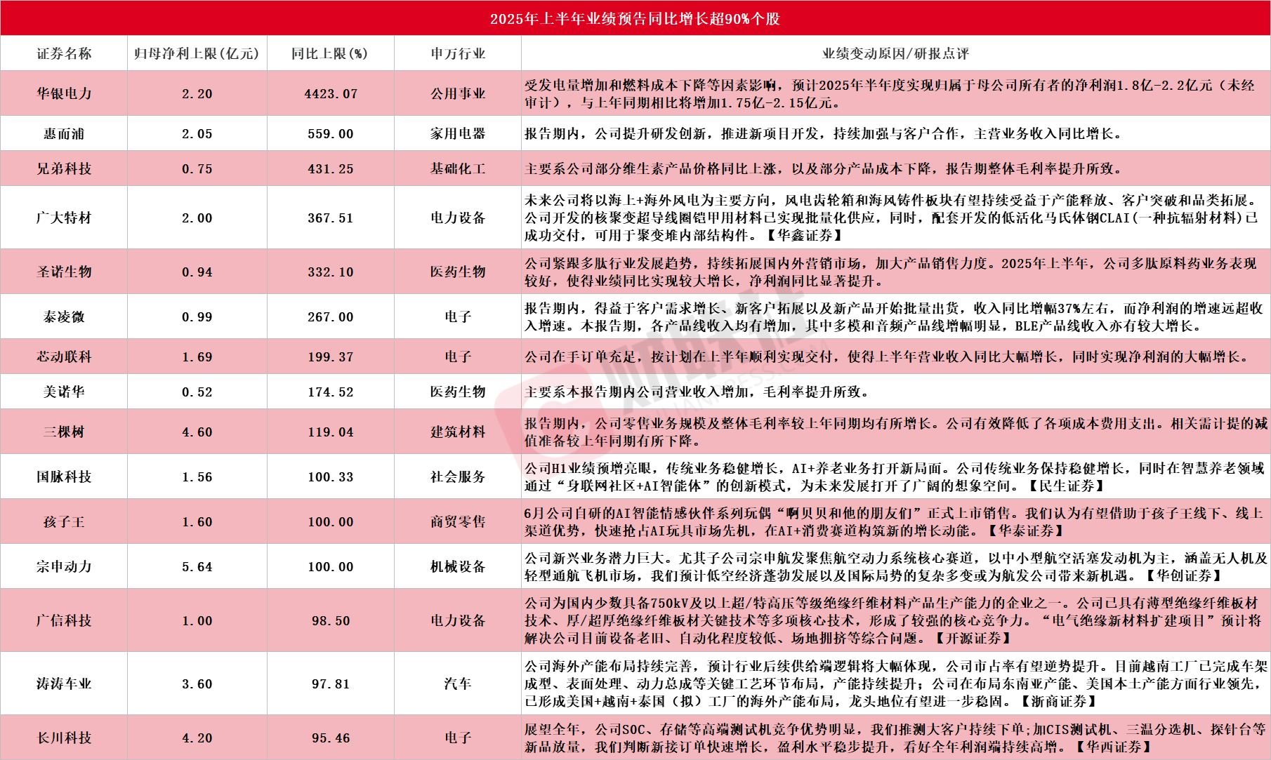 据Choice数据统计显示,截至发稿,共有49家A股上市公司发布2024年上半年业绩预告。其中,包括华银电力、惠而浦、兄弟科技、广大特材、圣诺生物、泰凌微、芯动联科、美诺华、三棵树、国脉科技、孩子王、宗申动力、广信科技、涛涛车业、长川科技等在内的15只个股净利同比预增上限超90%(具体情况见下图)。此外,翰宇药业、渝开发、麦迪科技等预计上半年同比将实现扭亏为盈。