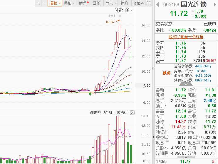 大盘分析及后市展望:今日,沪深两市开盘不一。沪指小幅低开或震荡,随后于上周五收盘处上下徘徊。而深成指高开低走下,始终于绿盘位置运行。午后,两市格局依旧,银行板块盘中拉升下多股创历史新高,而深成指以及创业板指绿盘运行中。部分科技、消费股业绩不及预期,导致资金撤离高估值成长股;与此同时,房地产板块大跌拖累市场表现。在“退市新规”筛选标准之下,部分个股可能面临退市风险警示(*ST)、其他风险警示(ST),ST股退市潮冲击市场情绪,全场跌停个股数量增加,投资者需要高度警惕业绩爆雷、退市等风险。