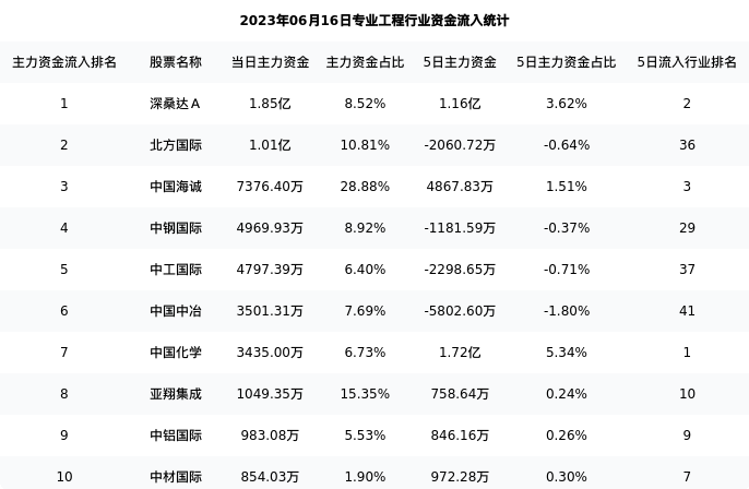 从主力资金流向来看,专业工程行业今日主力资金流入33.75亿元,在所有申万二级行业中排名:107/131。