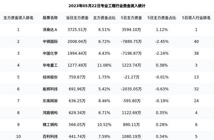 从主力资金流向来看,专业工程行业今日主力资金流入12.40亿元,在所有申万二级行业中排名:128/131。