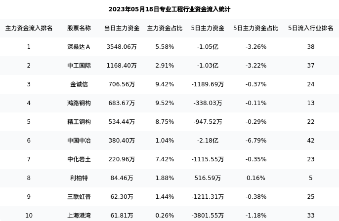 从主力资金流向来看,专业工程行业今日主力资金流入15.12亿元,在所有申万二级行业中排名:119/131。