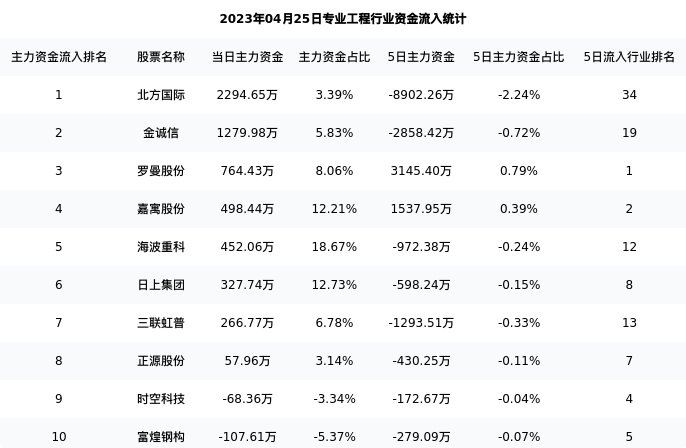 从主力资金流向来看,专业工程行业今日主力资金流入21.32亿元,在所有申万二级行业中排名:71/131。
