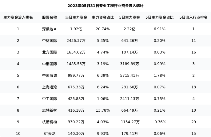 从主力资金流向来看,专业工程行业今日主力资金流入19.10亿元,在所有申万二级行业中排名:32/131。