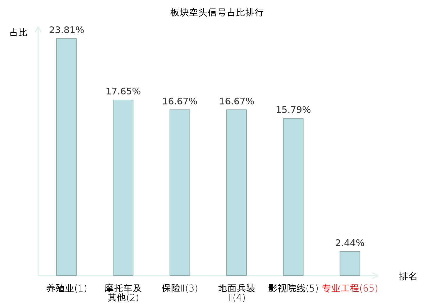 全市场所有行业板块中主力空头信号占比排名中,养殖业板块位居第一。养殖业板块名次提升最快,较昨日上升114位。