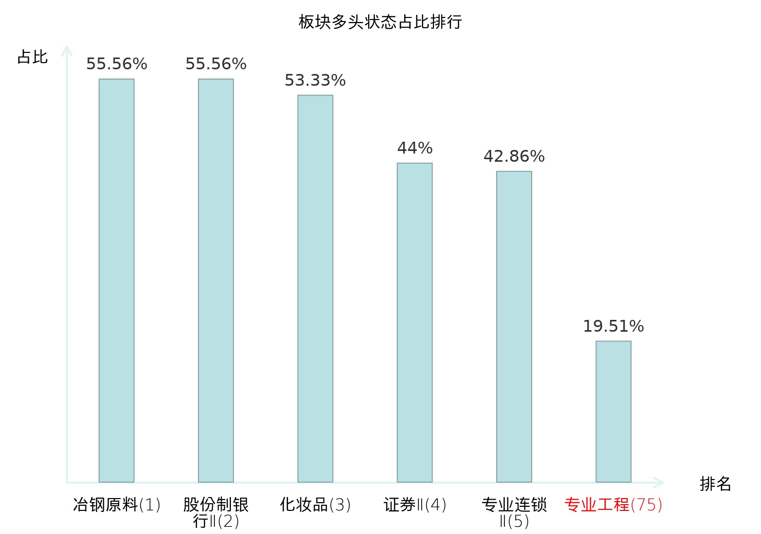 全市场所有行业板块中主力多头状态占比排名中,冶钢原料板块位居第一。保险Ⅱ板块名次提升最快,较昨日上升114位。