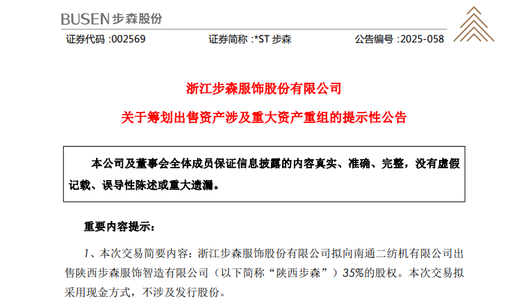 9月7日晚间*ST步森(002569)公告,为优化资产结构,改善现金流状况,集中资源进一步聚焦主业,筹划拟以现金方式向南通二纺机有限公司(下称“南通二纺机”)出售陕西步森服饰智造有限公司(下称“陕西步森”)35%的股权。本次交易完成后,公司将不再持有陕西步森任何股权。