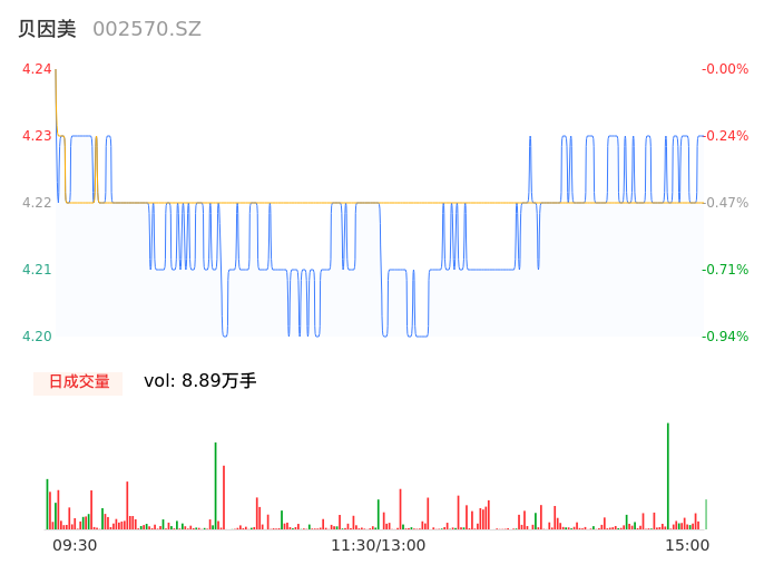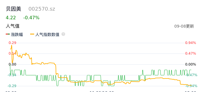 09月08日,贝因美收报4.22,股价涨幅-0.47%,成交金额3748.05万元,换手率0.82%。