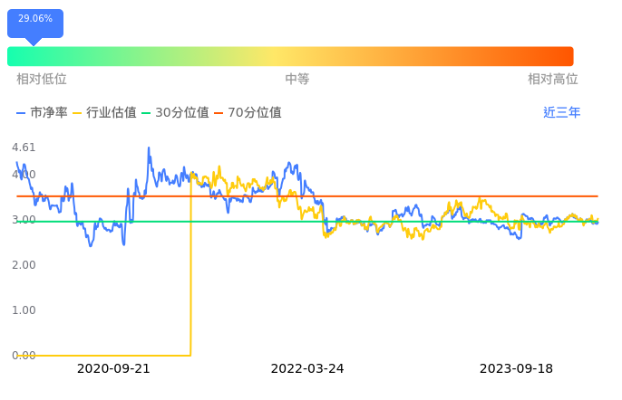 贝因美当前市净率PB为2.94,在所属的饮料乳品中,市净率PB排13,前五名分别为三元股份市净率1.48、庄园牧场市净率1.62、维维股份市净率1.65、光明乳业市净率1.76、天润乳业市净率1.81。贝因美当前市净率PB为2.94,超过近3年29.06%的历史数据。