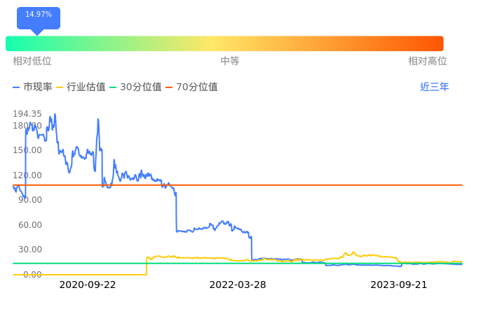 2023年09月21日,贝因美下跌0.94%收于4.20,今日成交金额4941.10万元。下文将从市盈率PETTM、市净率PB、市现率3个角度去分析公司估值情况。