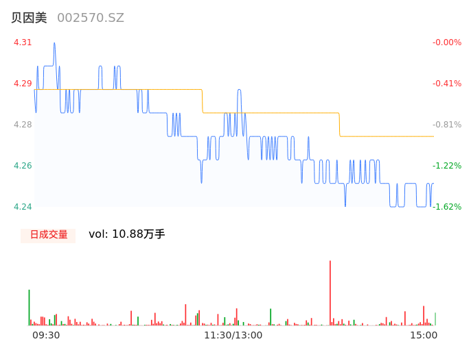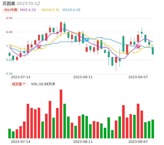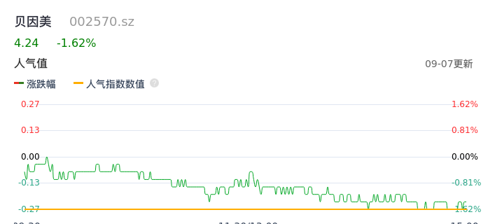09月07日,贝因美收报4.24,股价涨幅-1.62%,成交金额4643.65万元,换手率1.01%。