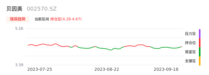 我们来看一下该股的九方特色指标强弱趋势的情况:贝因美近日从观望区上穿到持仓区。股价短期站稳多头区域,上升动能仍较为充足,可积极关注。后续重点关注上方压力位:4.67元是否能突破上攻。