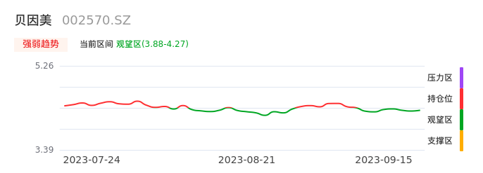 我们来看一下该股的九方特色指标强弱趋势的情况:贝因美自09月07日从持仓区下穿到观望区。股价近期持续下跌后,短期出现止跌迹象。后续重点关注能否再次站上多空分界点:4.27元。如未能有效突破则可能进入新一轮空头行情。