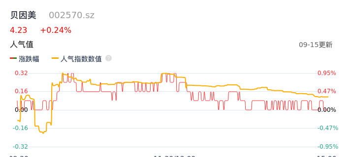 09月15日,贝因美收报4.23,股价涨幅0.24%,成交金额3008.00万元,换手率0.66%。
