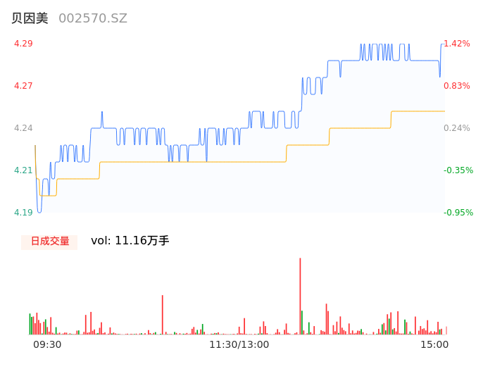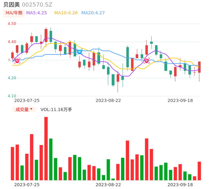 09月18日,贝因美收报4.29,股价涨幅1.42%,成交金额4743.52万元,换手率1.03%。