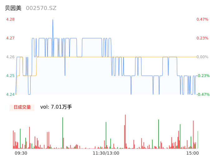 09月20日,贝因美收报4.24,股价涨幅-0.47%,成交金额2981.37万元,换手率0.65%。