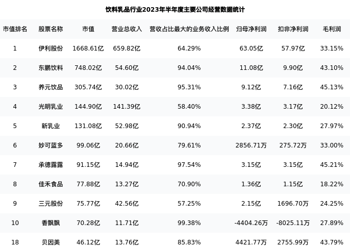 贝因美最新报告期数据为半年度,下表汇总了饮料乳品行业内市值靠前的公司半年度主要经营数据