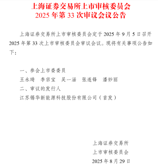 8月29日,上交所网站发布公告显示,上海证券交易所上市审核委员会将于2025年9月5日召开2025年第33次上市审核委员会审议会议,届时将审议江苏锡华新能源科技股份有限公司(以下简称“锡华科技”或“公司”)的首发上市申请。