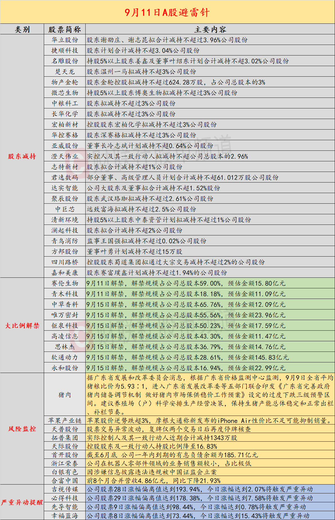 导读:财联社9月11日投资避雷针,近日,A股及海外市场潜在风险事件如下。国内经济信息方面包括:1)广东省猪粮比价进入过度下跌三级预警区间;2)工信部等六部门联合部署开展汽车行业网络乱象专项整治行动;公司方面重点关注包括:1)11连板天普股份因股票交易异常波动,复牌仅两个交易日后再度停牌核查;2)拓普集团实际控制人及其一致行动人近期合计减持1343万股;海外市场重点关注包括:1)美股三大指数收盘涨跌不一,亚马逊、苹果跌超3%;2)苹果股价逆势跌超3%,摩根大通称iPhone Air性价比不足可能抑制销量。