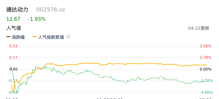 04月22日,通达动力收报12.67,股价涨幅-1.93%,成交金额3632.08万元,换手率1.76%。