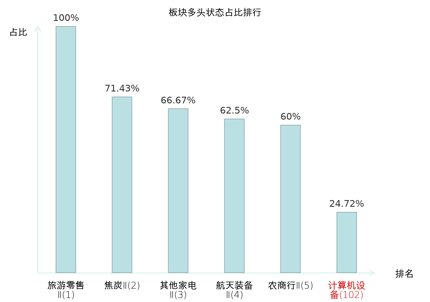 全市场所有行业板块中主力多头状态占比排名中,旅游零售Ⅱ板块位居第一。白酒Ⅱ板块名次提升最快,较昨日上升50位。