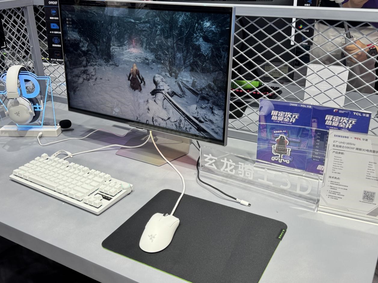 展品中,一款三星的27" UHD 165Hz玄龙骑士G90XF裸眼3D电竞显示器引起多位玩家试玩、围观。据介绍,三星的这款裸眼3D电竞显示器可让玩家无需佩戴3D眼镜即可实现高精度的双眼视差优化,带来沉浸式的裸眼3D体验。