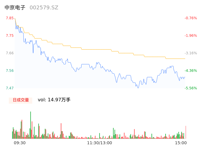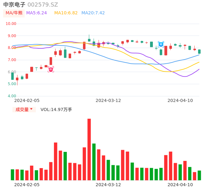 04月10日,中京电子收报7.53,股价涨幅-4.80%,成交金额1.14亿元,换手率2.57%。