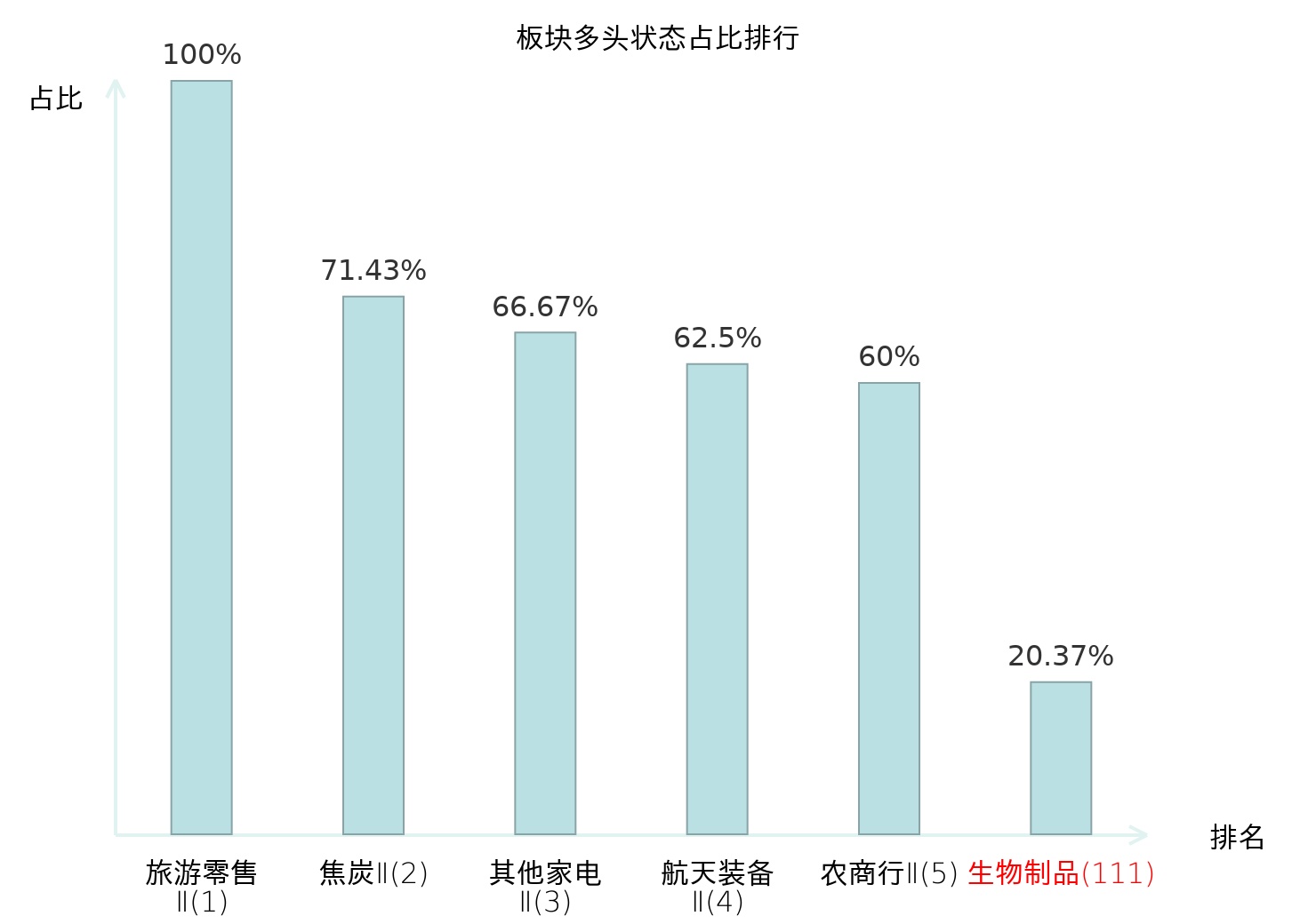 全市场所有行业板块中主力多头状态占比排名中,旅游零售Ⅱ板块位居第一。白酒Ⅱ板块名次提升最快,较昨日上升50位。