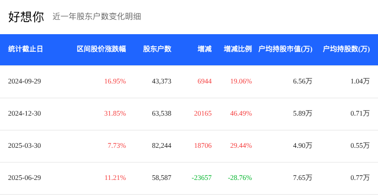 截至2025年6月30日,好想你的股东户数为5.86万,相较于2025年3月31日减少了28.76%,户均持股数量达到40.38股,户均持股市值为7.65万元,环比增长了56.12%。这表明,股东集中度有所提升,大股东持股比例增加。