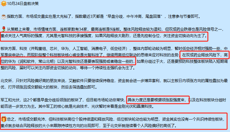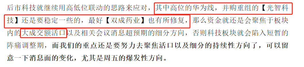 那么后市应该如何应对科技板块的这种节奏呢?就延续高低位联动的方式来处理,首先最有代表性的【光智科技】、【双成药业】以及华为线不能连续迎来大跌,其次在市场成交量稳定的情况下,根据自己的风格,可以选择日内的细分领涨方向,也可以在调整的时候去尝试低吸人气大成交额个股,用先手准备灵活应对,直到大风险释放的到来。而策略的重点肯定是聚焦活口以及细分的持续性方向为主,而明天又是周五了,一旦细分方向爆发,是很容易被市场认可的,继续关注消息面的变化。