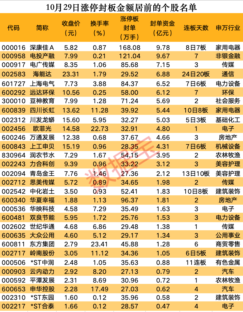 以封单金额计算,48股封单金额超1亿元,其中深康佳A、电投产融、电广传媒封单金额居前,分别为9.78亿元、9.67亿元、7.15亿元。
