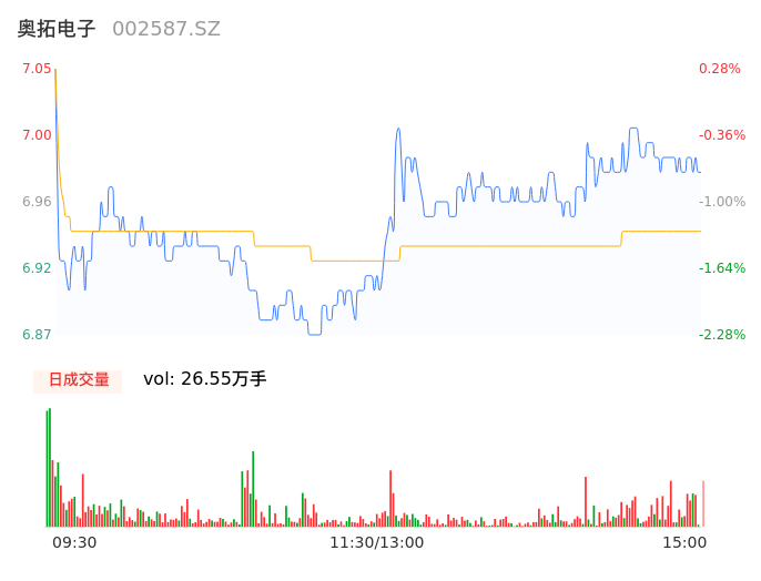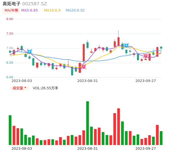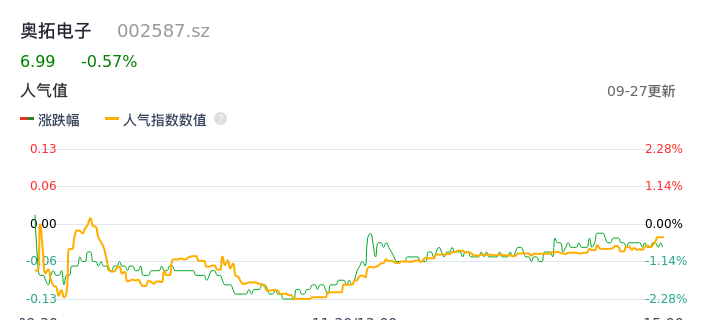 09月27日,奥拓电子收报6.99,股价涨幅-0.57%,成交金额1.84亿元,换手率5.17%。