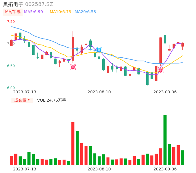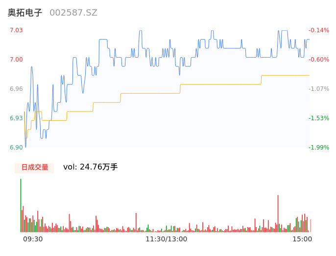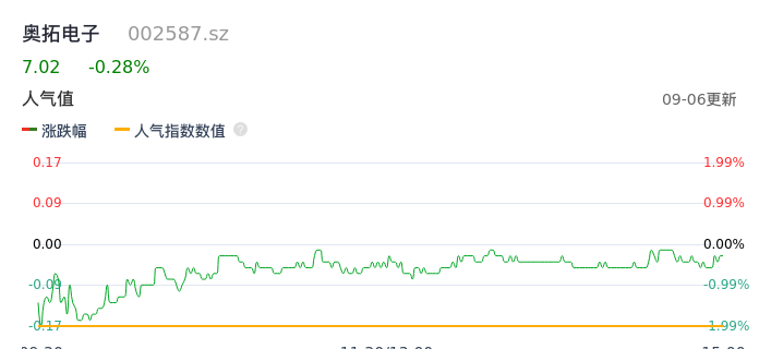 09月06日,奥拓电子收报7.02,股价涨幅-0.28%,成交金额1.73亿元,换手率4.82%。