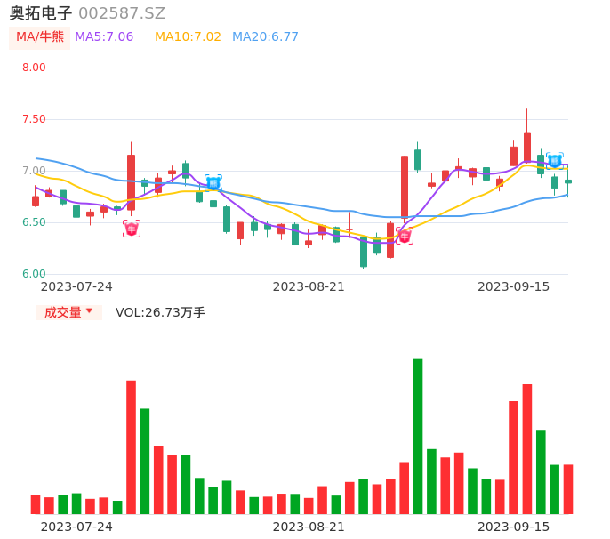09月15日,奥拓电子收报6.88,股价涨幅0.73%,成交金额1.84亿元,换手率5.21%。