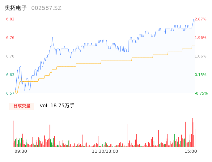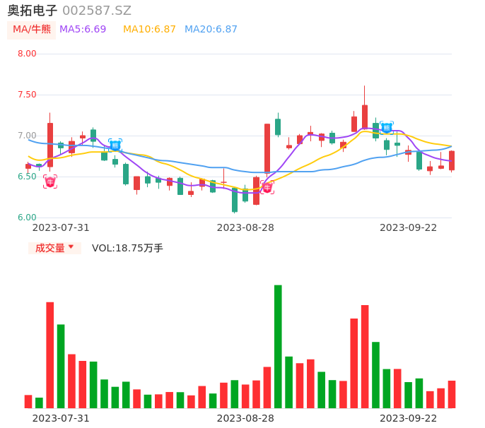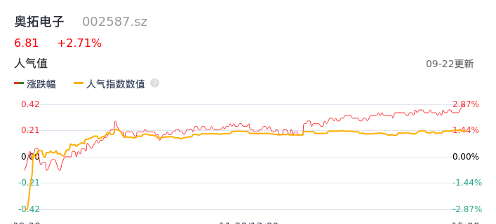 09月22日,奥拓电子收报6.81,股价涨幅2.71%,成交金额1.26亿元,换手率3.65%。