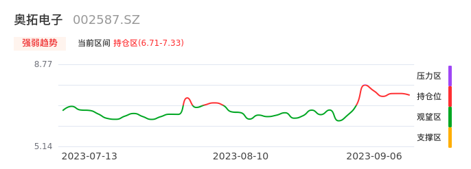 我们来看一下该股的九方特色指标强弱趋势的情况:奥拓电子自08月29日从观望区上穿到持仓区。股价近期在多头区域回调整理。后续重点关注多空分界点的争夺:6.71元。如未能有效站稳则可能重新回到空头行情。