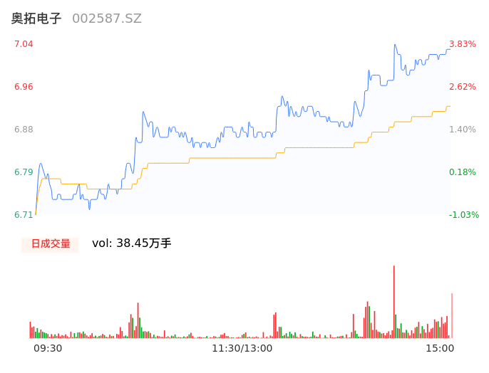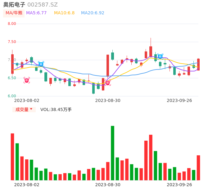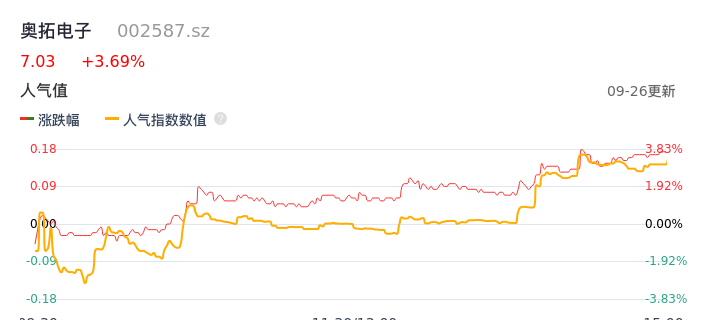 09月26日,奥拓电子收报7.03,股价涨幅3.69%,成交金额2.66亿元,换手率7.49%。