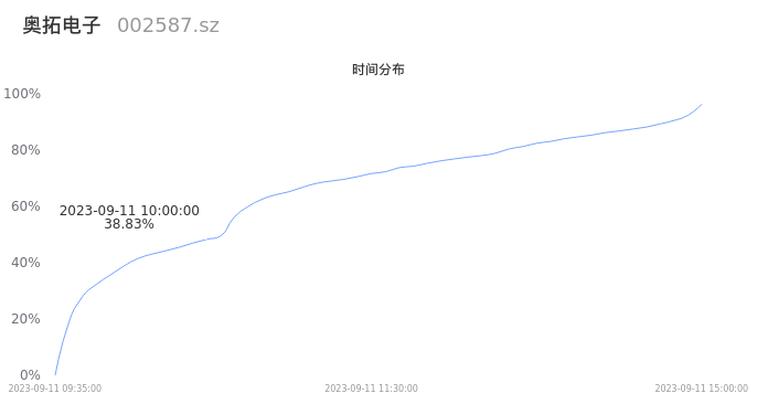 002587奥拓电子2023年09月11日成交61.05万手,成交金额4.40亿元,相较昨日放量42.50万手,换手率11.90%,成交活跃。